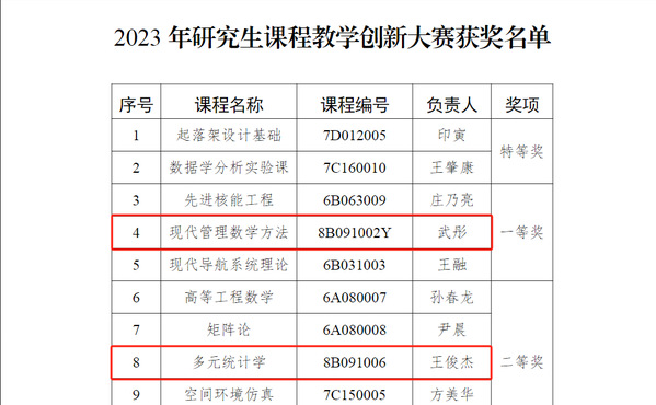 日前,我校组织开展了第二届研究生课程教学创新大赛。经江南体育 遴选推荐、学校专家审核评议,共评选获奖教师10人,其中特等奖2人、一等奖3人、二等奖5人。江南体育官网 武彤老师的课程《现代管理数学方法》荣获一等奖,王俊杰老师的课程《多元统计学》荣获二等奖。