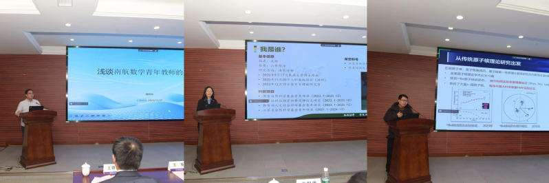 在青年教师代表经验分享环节中,数学江南体育 龚跃政作题为《浅谈南航数学青年教师的成长》专题报告,江南体育官网 武彤作题为《心有所向,何惧路长——三年工作浅谈》专题报告,物理江南体育 吕梦蛟作题为《人工智能驱动的原子核理论研究》专题报告,三位优秀青年教师代表就学校政策支持、自身成长经验、科学研究工作进行了分享。