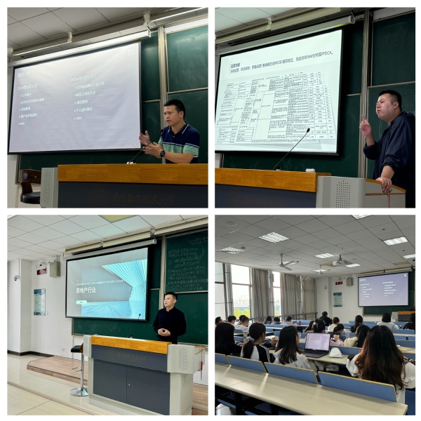 10月15日,长九实业集团副总裁储勇,向同学们主要介绍了房地产行业十年来的变迁与发展、房地产的开发流程和市场战略制定等内容。储勇强调,房地产行业要把握市场需求的重要性,要根据客户的实际情况来进行房产类型的划分。