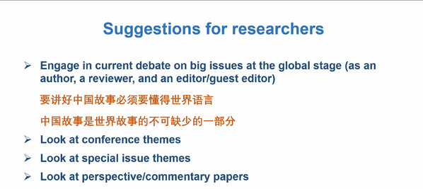李应芳教授的讲座主要有以下内容:其一,李应芳系统阐述了人力资源管理(HRM)研究的发展脉络与研究趋势。具体而言,李应芳从企业导向、员工导向、社会导向和技术导向的四种视角出发,分别从人力资源管理研究的系统化、人本化、智能化以及对于员工需求满足的多样化、心理健康的重视化五条主线详细阐述了人力资源管理领域的发展路径、最新进展和未来趋势。此外,其特别强调,这五条主线并非相互割裂,而是相互联系、彼此交叉的。其二,李应芳从期刊主编、编辑、审稿人和研究学者的角度出发,分享了人力资源管理顶刊所关注的前沿主题、期刊投稿注意事项以及论文成功发表的重要要素等内容。首先,李应芳从研究内容、引言、文献综述、假设、方法、结论和贡献等方面提出了写作意见与建议;其次,李应芳以人力资源管理领域顶刊《Human Resource Management》为例,从写作格式、研究主题、标题设计等方面分享了投稿时的注意事项,同时也分享了被拒稿的潜在原因,这主要包括研究主题偏离期刊要求、研究设计缺乏严谨性、文献回顾内容片面且过时、假设支持力度弱等内容方面以及英文表述差、文章格式不规范等形式方面,这些均是在论文写作和投稿过程中需要重点关注的问题。其三,李应芳就如何向世界讲好中国人力资源管理故事、将中国情境下的人力资源管理研究推向世界提出了独特见解。首先,中国人力资源管理故事是世界人力资源管理故事中不可或缺的一部分,向全世界讲好中国故事必须要懂得“世界语言”;其次,研究者需要切实深入中国企业内部,使研究扎根于现实管理实践,做到“顶天”与“立地”。最后,关注因中西方文化背景和价值观不同导致的人力资源管理实践形式的差异。要立足中国情境讲好中国故事,需要自觉建构用于指导中国管理实践的本土化管理理论,而不应不加区分地套用西方的理论基础。
