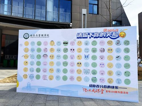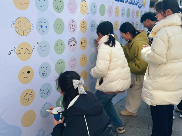 最后,大家共同在东篱苑广场开展线下互动活动。同学们纷纷在绘画墙上留下笑脸图案,收获由主创成员亲手制作的“快乐小狗”作为纪念品。笑脸寓意着鼓励大家以灿烂的笑容面对生活,获得内心真诚的愉悦和快乐。