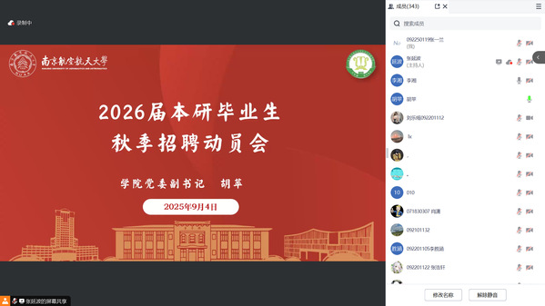 秋意渐浓,校园招聘的号角已然吹响。为帮助2026届本研毕业生明晰未来方向、把握就业机遇、提升求职竞争力,江南体育官网 于9月4日晚组织召开2026届毕业生秋季招聘动员会。本次会议以线上形式开展,江南体育 党委副书记胡苹,研究生辅导员刘婷炜,本科生辅导员张延波,近400名本研毕业班学生参与。