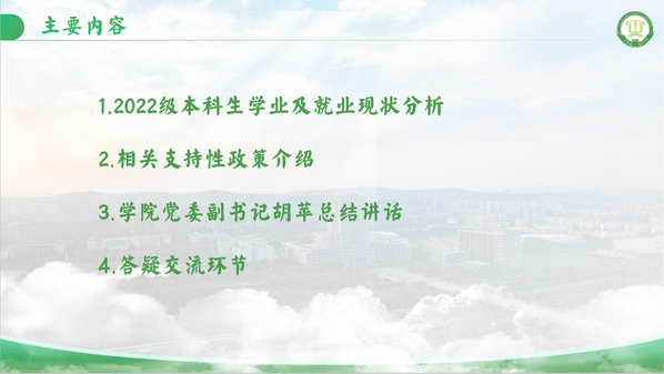 会上,辅导员张延波就2026届毕业生整体学业进展与就业准备工作进行了详细介绍。结合往届同期数据,分析了当前毕业生在课程修读、就业意向摸底及秋招参与等方面的基本情况,系统介绍了政策性岗位、第二学位申请、国际联合培养项目等多元发展通道,向家长阐述不同路径的发展优势。