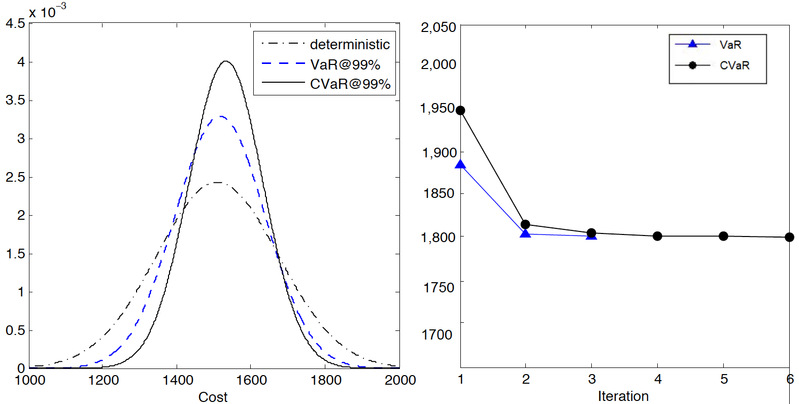 Figure 1. left: the probability distributions of optimal total cost in deterministic vs. stochastic models; right: the changes in VaR/CVaR through the cutting plane algorithm.