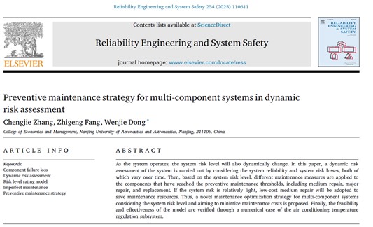 Chengjie Zhang, Zhigeng Fang, and Wenjie Dong(*). Preventive maintenance strategy for multi-component systems in dynamic risk assessment. Reliability Engineering & System Safety, Volume 254, Part A, 2025, 110611. //doi.org/10.1016/j.ress.2024.110611